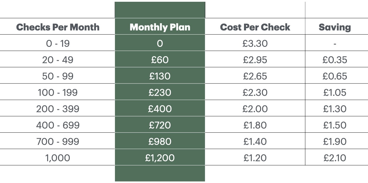 Each monthly plan has a fixed fee, calculated using the minimum number of checks in the band multiplied by the discounted cost per check (see below). This fee covers only the minimum number of checks for that band. Any additional checks above that minimum are charged at the same discounted cost per check. So for example, If you're on the 50–99 checks band: Your monthly plan is £130 (50 checks × £2.65) and if you do 60 checks, the additional 10 checks are charged at £2.65 each.All monthly plans subject to VAT at 20%